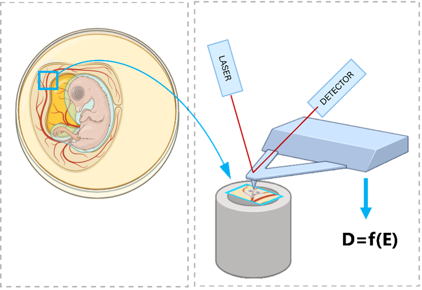 The objective of this thesis project is to measure via Atomic Force Microscopy (AFM) the local stiffness of tissue patches from chicken embryos. Each patch is implanted with several tumor microenvironments. The candidate will follow the tumor microenvironment implants, perform AFM measurements to extract quantitative data, and carry out the subsequent data analysis, with the ultimate goal of optimizing a computational numerical model of the system. AFM-based micromechanical experiments are aimed at evaluating the local mechanical response of embryonic tissues and following their dynamic evolution in situ under the action of targeted antitumor substances.